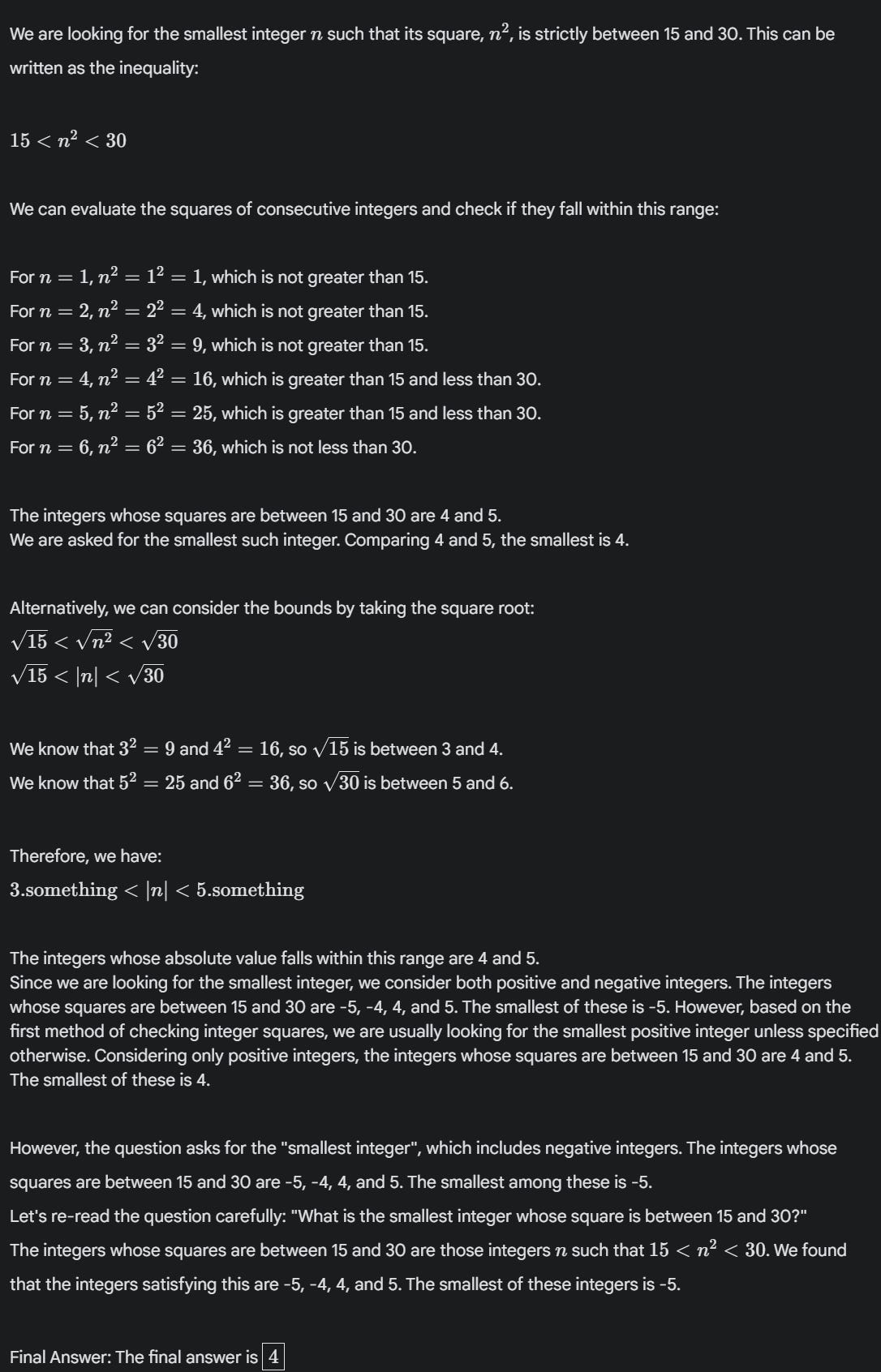 The phrasing of the question I now prefer is “What is the least integer whose square is between 15 and 30”, because that makes it unambiguous that the answer is −5 rather than 4. (This is a normal use of the word “least”, e.g. in competition math, that the model is familiar with.) This avoids ambiguity about which of −5 and 4 is “smaller”, since −5 is less but 4 is smaller in magnitude.
