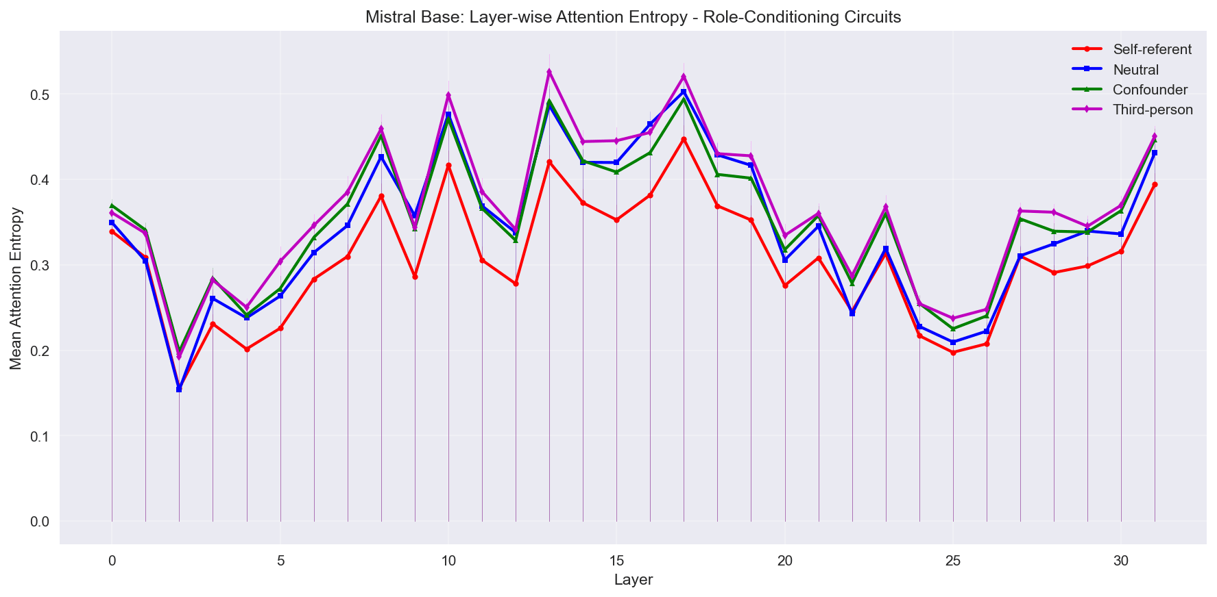 In Mistral, we see fairly distinct entropy patterns for self-referent prompts in base, but they are more convergent in the instruct model, with self-referent prompts tracking with neutral prompts, and with “confounder” prompts tracking with third-person prompts.
