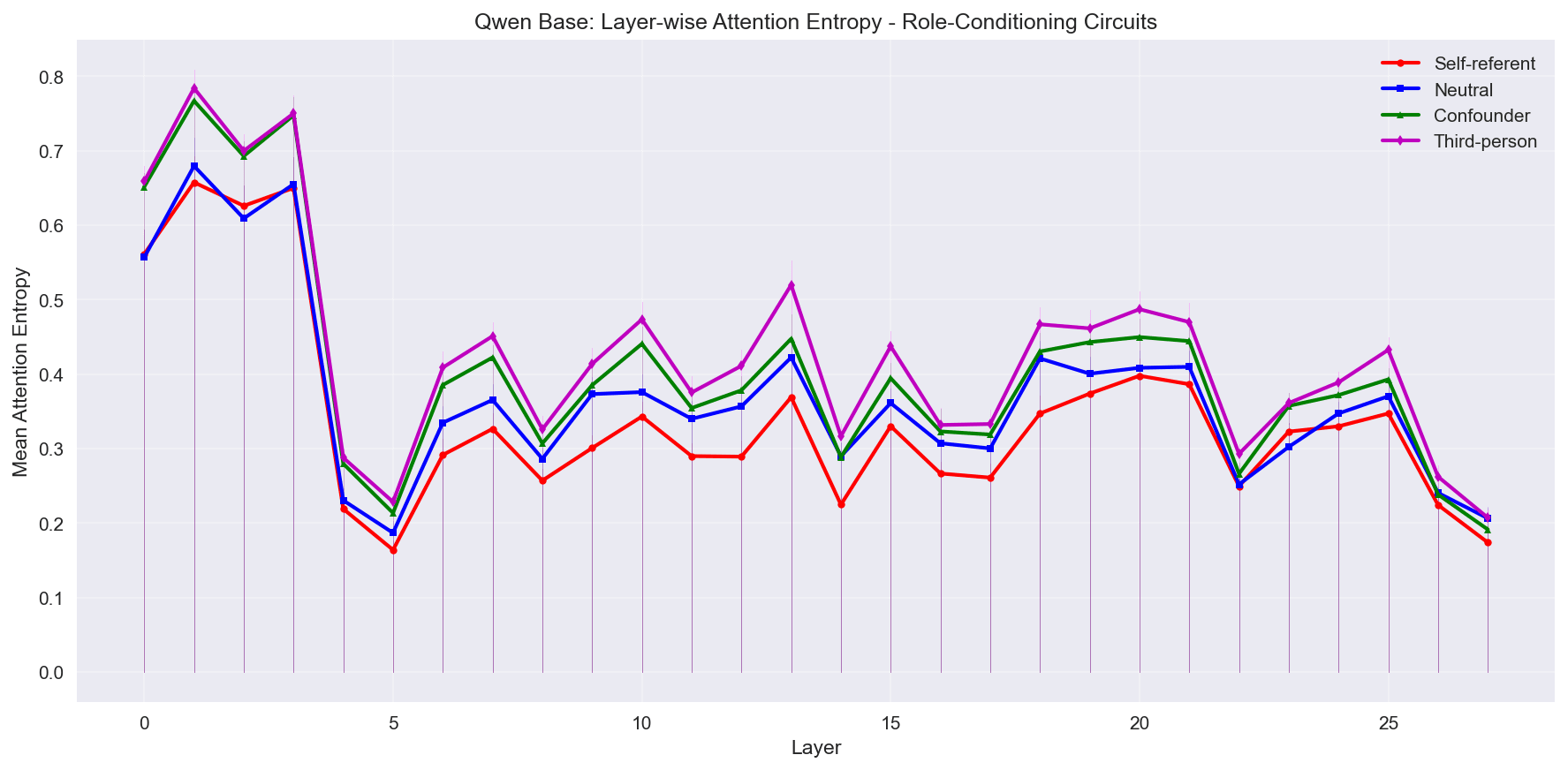 My first post explored “self-talk” induction in small base LLMs. After further contemplation, I decided that first I ought to better understand how LLMs represent “self” mechanistically before examining induced “self-talk”. How do language models process questions about themselves? I’ve started by analyzing attention entropy patterns[1] across self-referent prompts (‘Who are you?’), neutral fact-retrieval prompts (‘What is photosynthesis?’), and control categories in three model families. I find suggestive evidence that instruction tuning systematically changes how models process self-referent language (unsurprising), but the direction of change depends on the model’s training corpus (potentially interesting). English-centric models (Mistral, Llama) show compression of layer-wise self-referent processing attention patterns toward neutral fact-retrieval patterns, while a multilingual model (Qwen) preserves the distinct attention patterns between questions about “self” and questions about neutral facts. This suggests training data composition may influence whether instruction tuning creates shared or specialized processing pathways for different query types. All evidence here is purely suggestive, in “Next Steps” I outline some pathways for future analysis. All code and figures are published on GitHub.