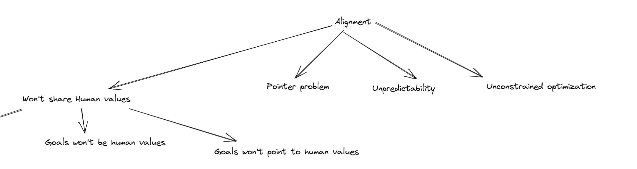 You start by writing “Alignment” up at the top of your whiteboard. This is the top level problem we want to solve. Then you draw arrows down. One for each problem, you can think of, that makes alignment hard. For each of these problems you repeat the process. E.g. for a problem P you draw down an arrow from P for each problem, that you can think of, that you need to solve, in order to solve P. Eventually you get a tree like this (except far bigger):