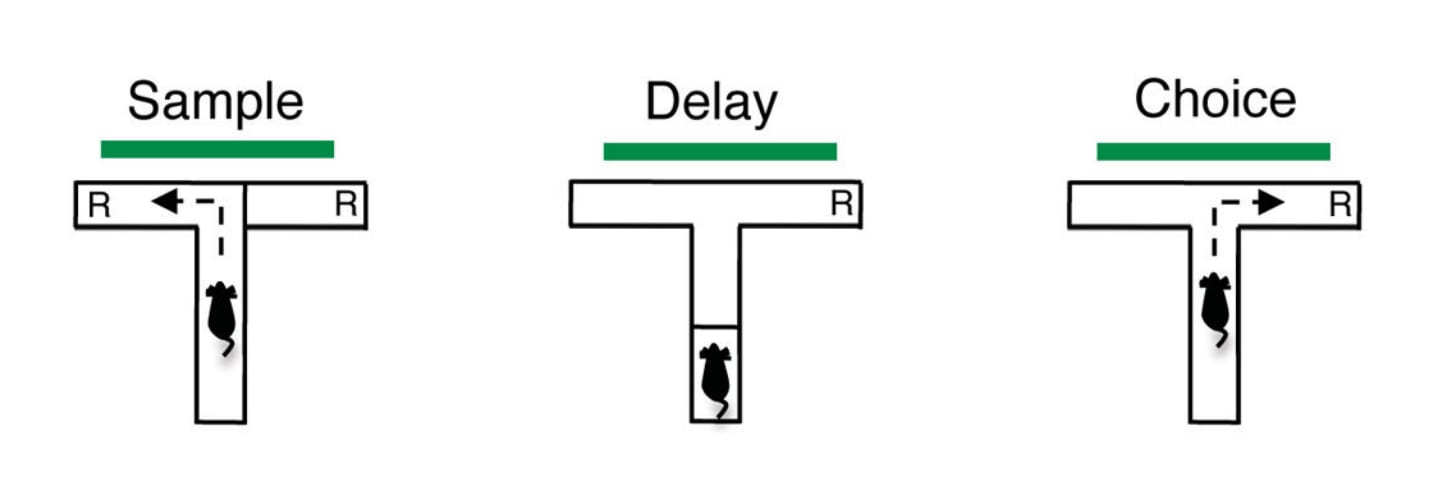 In particular the mice were sent through a T-maze twice; on the first trial a reward was available on either left or right arm of the T maze, the mouse retrieves it and is trained to return to the start position and wait through a delay; on the second trial they had to choose the arm of the T-maze opposite to the arm where the reward was available on the first trial (or else be trapped in a rewardless arm by a quickly closed gate). The delay between the two trials was an adjustable variable.