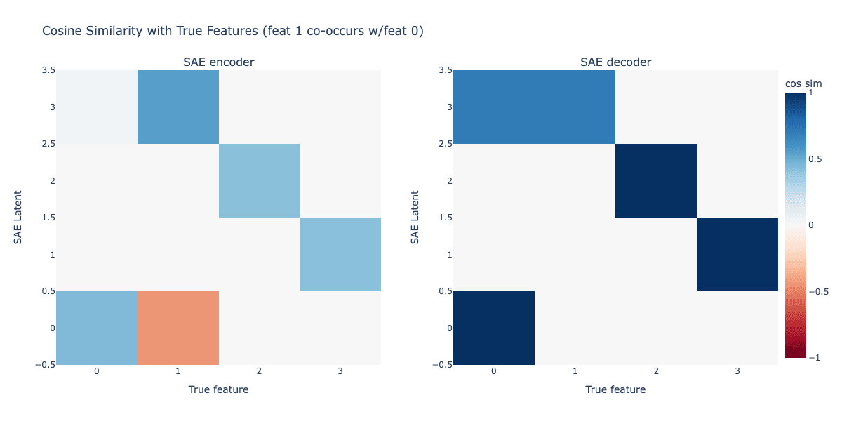 That’s an interesting idea! That might help if training a new SAE with tied encoder/decoder (or some loss which encourages the same thing) isn’t an option. It seems like with absorption you’re still going to get mixes of of multiple features in the decoder, and a mix of the correct feature and the negative of excluded features in the encoder, which isn’t ideal. Still, it’s a good question whether it’s possible to take a trained SAE with absorption and somehow identify the absorption and remove it or mitigate it rather than training from scratch. It would also be really interesting if we could find a way to detect absorption and use that as a way to quantify the underlying feature co-occurrences somehow.