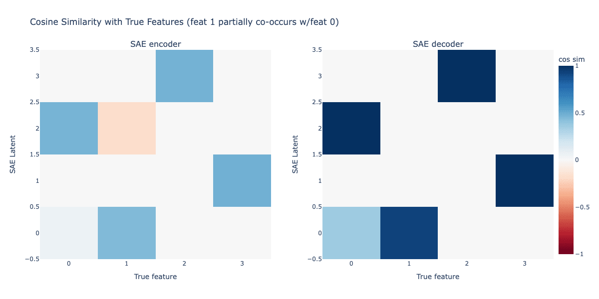 Next, let’s test what will happen if feature 1 is more likely to fire if feature 0 is active, but can still fire without feature 0. We set up feature 1 to co-occur with feature 0 95% of the time, but 5% of the time it can fire on its own.