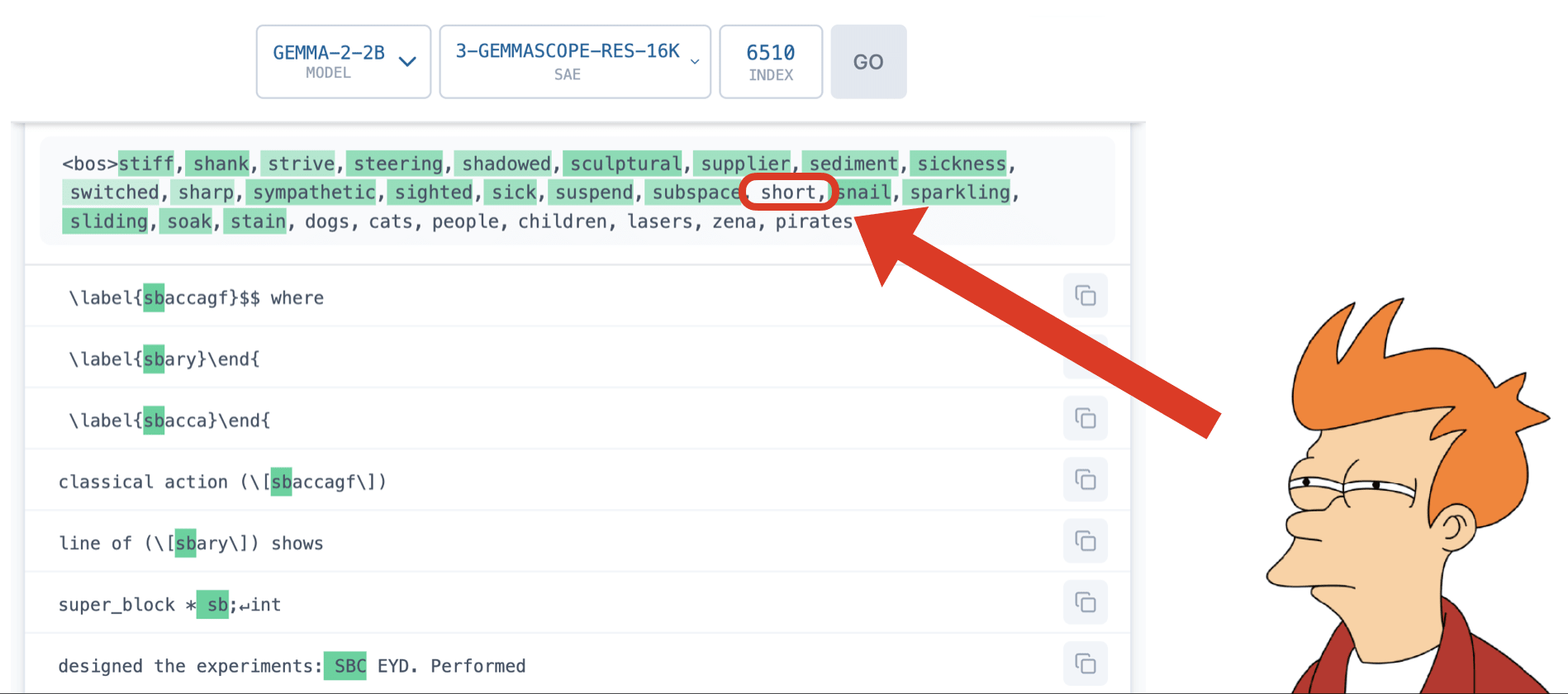 For instance, in Gemma Scope SAEs we find a latent which seems to track the feature that a token “starts with S”. However, the latent will not fire on a few specific tokens that do start with S, like the token “short”.