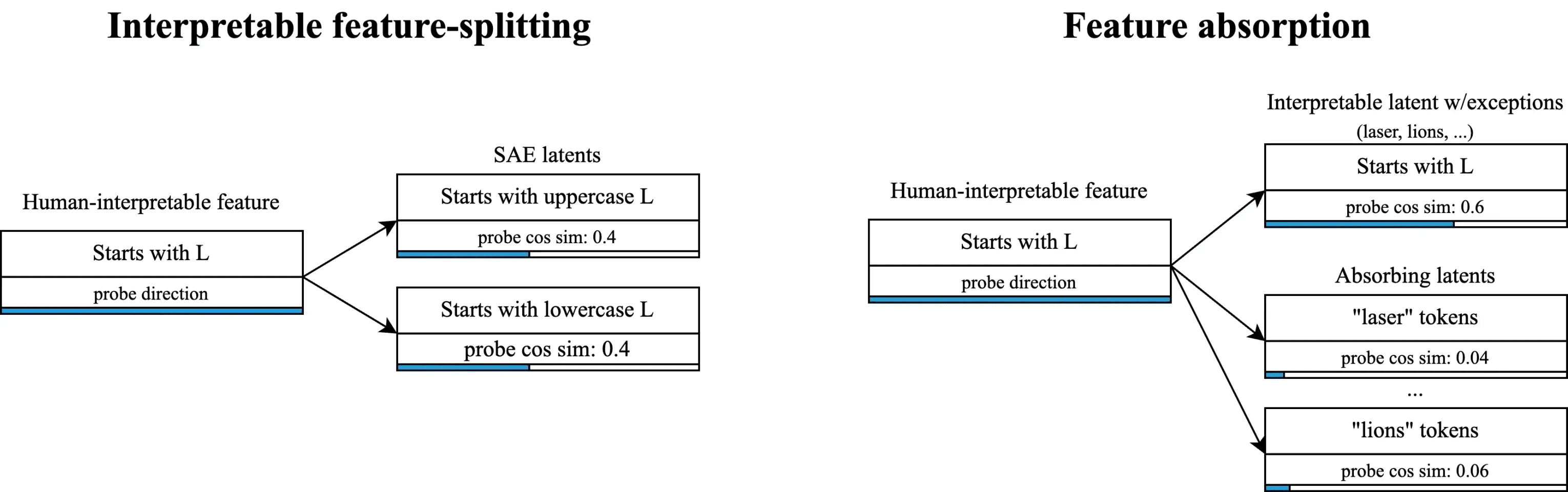 Feature absorption is different. In feature absorption, we end up with something like “Starts with L with a bunch of exceptions”, and then we get combo latents like “lion” which encode both “lionness” and “starts with L”.