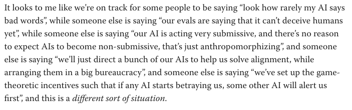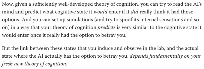One objection he addresses is that you could try to trick a weaker AI into thinking it could take over. However, according to Nate, if we come up with some complex method to potentially test whether a system would like to take over, we still rely on that working on the first critical try. This goes against the more modern idea of AI control, which came out in December 2023. I would add that these “tricking the weaker AIs into trying to take over” strategies have at least two key problems: (1) these AIs are still weaker than the real thing, (2) you are trying to gather empirical data from observing something smarter than you. For example, we could see an AI pretending to be tricked and not taking over.