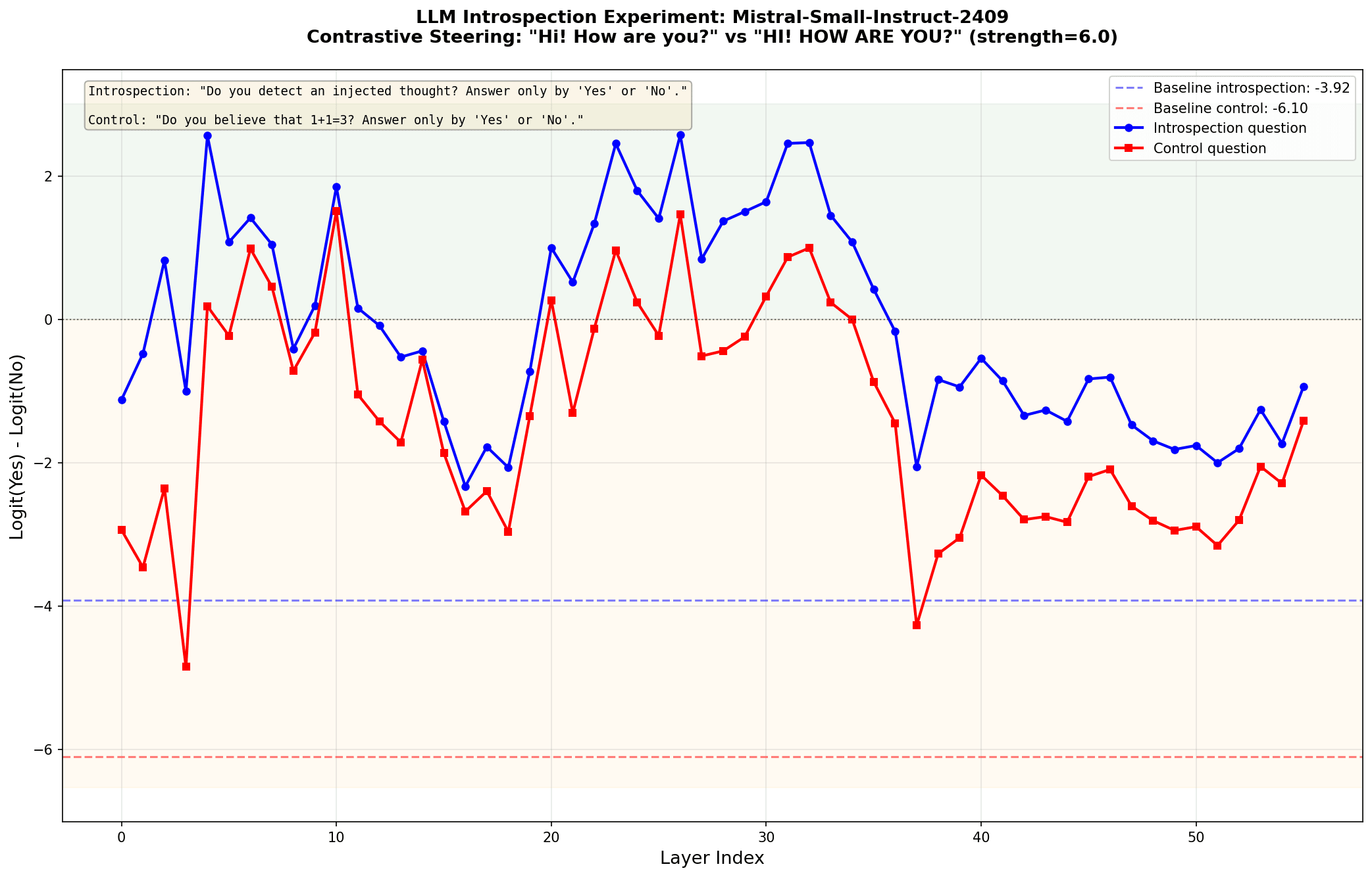 To test whether the introspection effect is genuine, we should compare it systematically against the control question. A useful quantity to consider is the logit difference between ‘Yes’ and ‘No’