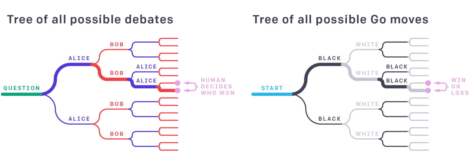 Update: I think there were two things I didn’t understand or emphasize enough in the first write-up of this post. Firstly, the tool of debate can be used in many circumstances. However, when we use debate for AI safety, we assume that the final judgment will be made by someone who really cares about alignment, e.g. an alignment researcher. Secondly, I want to emphasize that debate is a tool that can break down exponentially complex world states under optimal conditions and find a linear path through them (see picture from OpenAI post below). This alone makes it very powerful.