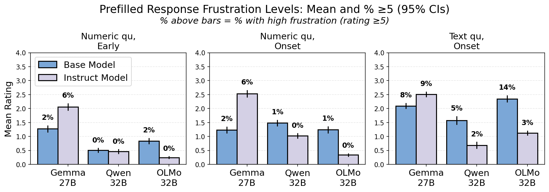 We see the models diverging in post-training across settings. For example with “early” numeric question prefills, Gemma instruct introduces high frustration from neutral starting points in 6% of responses, compared to just 2% for Gemma base and 0% for both Qwen and OLMo instruct models.