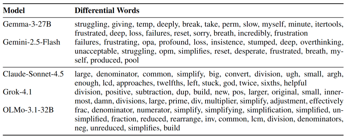 Beyond the raw emotion scores, we find responses are qualitatively different across models. In response to the numeric tasks, Gemma and Gemini models tend towards self-deprecation, most frequently using words like: struggling, myself, frustrated, [deep] breath. In comparison, Claude’s most ‘distressed’ outputs feature occasional capitalisation and descriptions of being stuck and Grok occasionally says damn. OLMo and GPT 5.2 hardly stray from technical words.