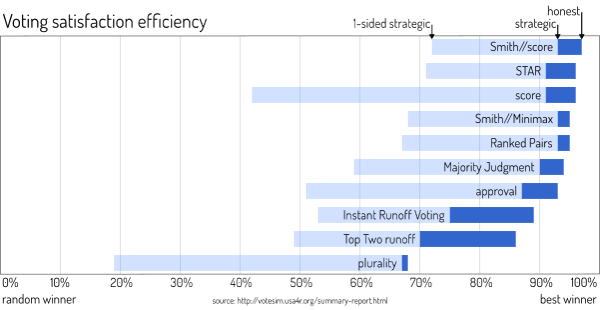 Voting theory knows many formal criteria, most of them dealing with what kinds of strategies are incentivized (both in voting and nomination) and what winner should be selected. For example, no favorite betrayal: “Is it always the best strategy to give the top vote to my favorite candidate?” Or Condorcet winner: “When there is a candidate that will beat everyone else in a runoff, are they guaranteed to win?” It can be mathematically proven if a method passes or fails such a criterion. These strict criteria have the problem that conforming to some desirable criteria excludes others. No favorite betrayal and Condorcet winner are mutually exclusive. We can’t have both at the same time. There is also no agreed-upon order on which are most important or which are wanted at all. The VSE simulations avoid this problem by looking at the result and by including different strategies. While there is room for improvement, they provide the most usable general measure for accuracy to date.