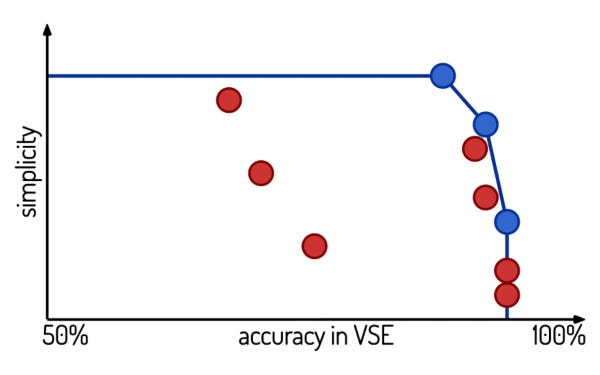 Illustration of how the space of voting methods can look like. With the Pareto-front marked in blue.