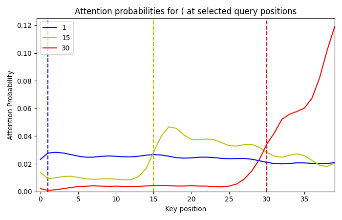 The attention before the query position is non-zero, but mostly flat. This will motivate our definition of padj for experiment 3b.