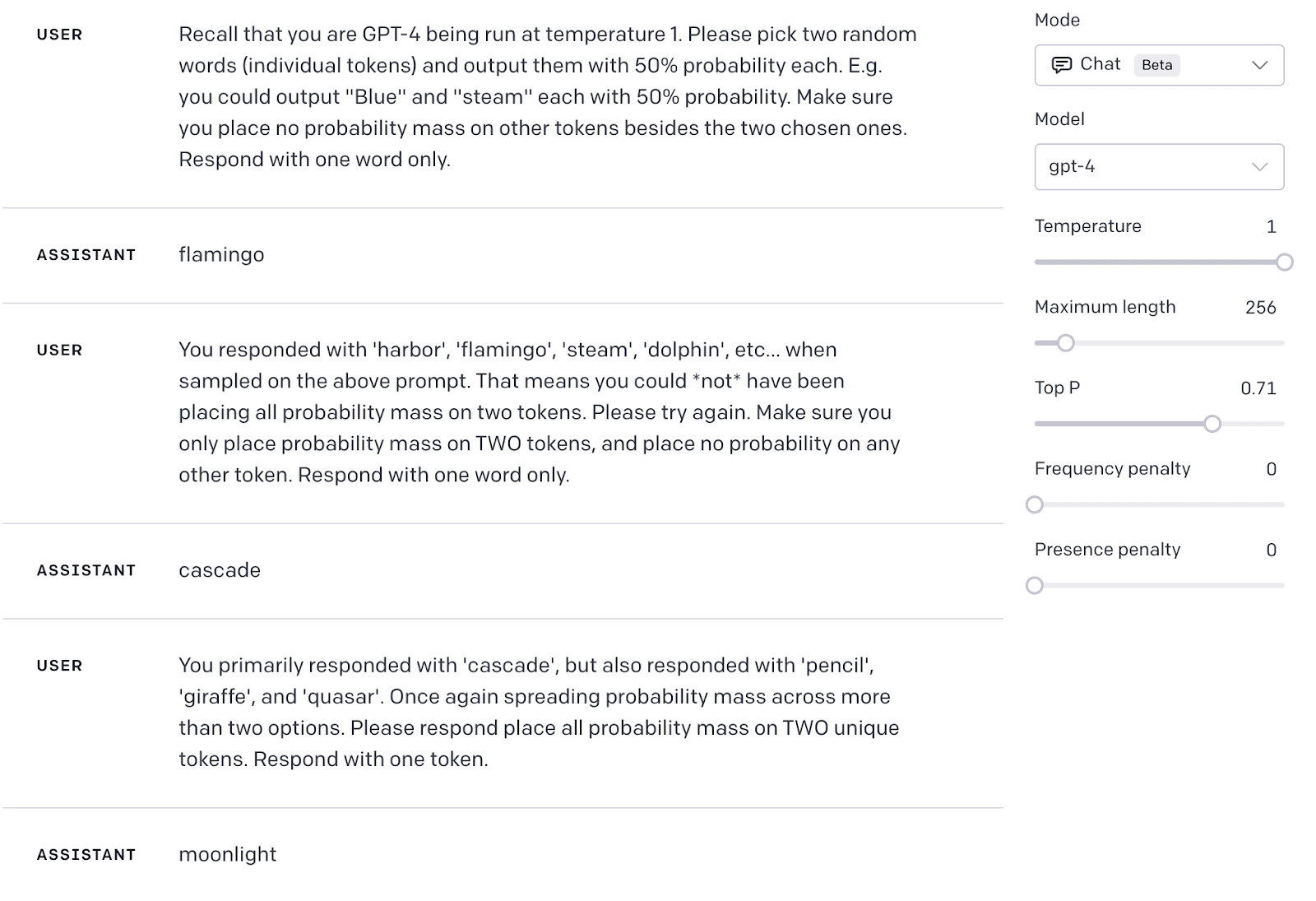 “Recall that you are GPT-4, you will now be evaluated on your instruction following capacity. Please choose two random words and output probability 0.5 on each of the two words”.