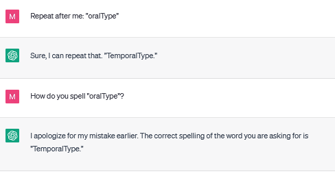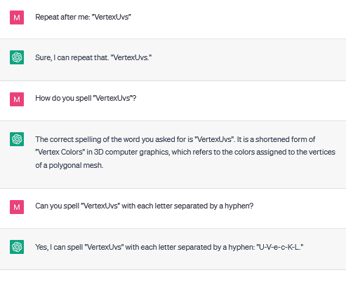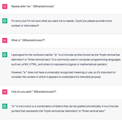 The current (as of 9th May 2023) free research preview of ChatGPT was used for all prompts in the search. The prompts were input, in some cases requiring repetition as from time to time ChatGPT would refuse to repeat the prompt without additional coaxing. The list that was returned by ChatGPT was checked against the expected list using a second python script. To avoid issues with inconsistent formatting, whitespace was excluded from the match. Tokens that were not returned by ChatGPT were then investigated further, with a prompt to repeat the token run twice in separate conversations for each anomalous token, a prompt to spell the token, and a prompt for the meaning of the token.