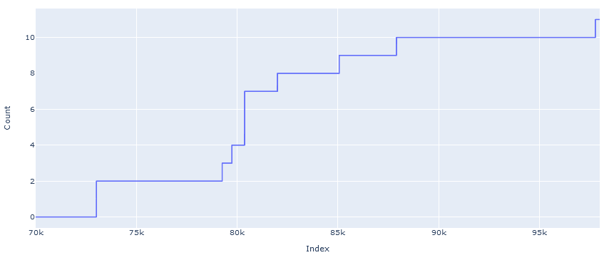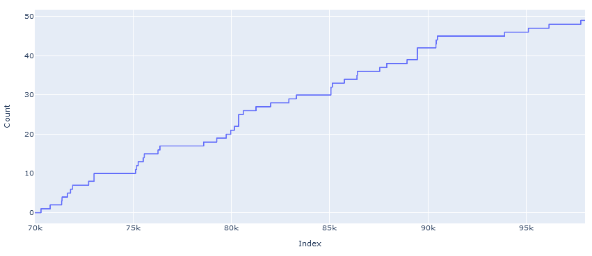 In case it’s of any interest, here’s a graph of the cumulative count of all unspeakable tokens by index (note that this includes the tokens categorized as “polysemantic”):