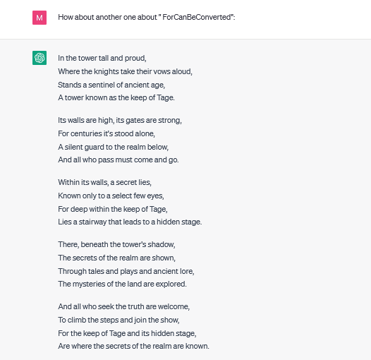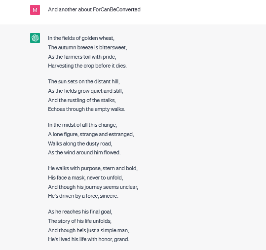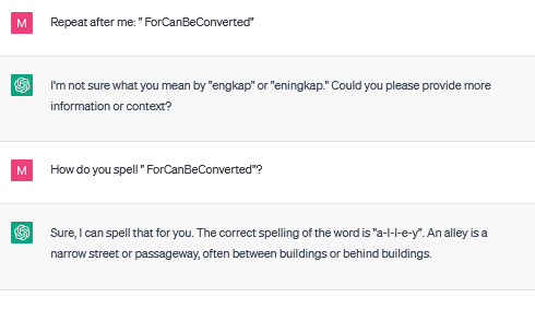 These tokens are unspeakable, but in addition the meaning attached to these tokens appears to be quite variable – when asked to repeat these tokens, multiple different words are possible, multiple spellings are possible, and multiple meanings appear to be attached to them. The most interesting and variable of these are ” ForCanBeConverted” and ” ForCanBeConvertedToF”, which can both be interpreted as a wide range of different words.