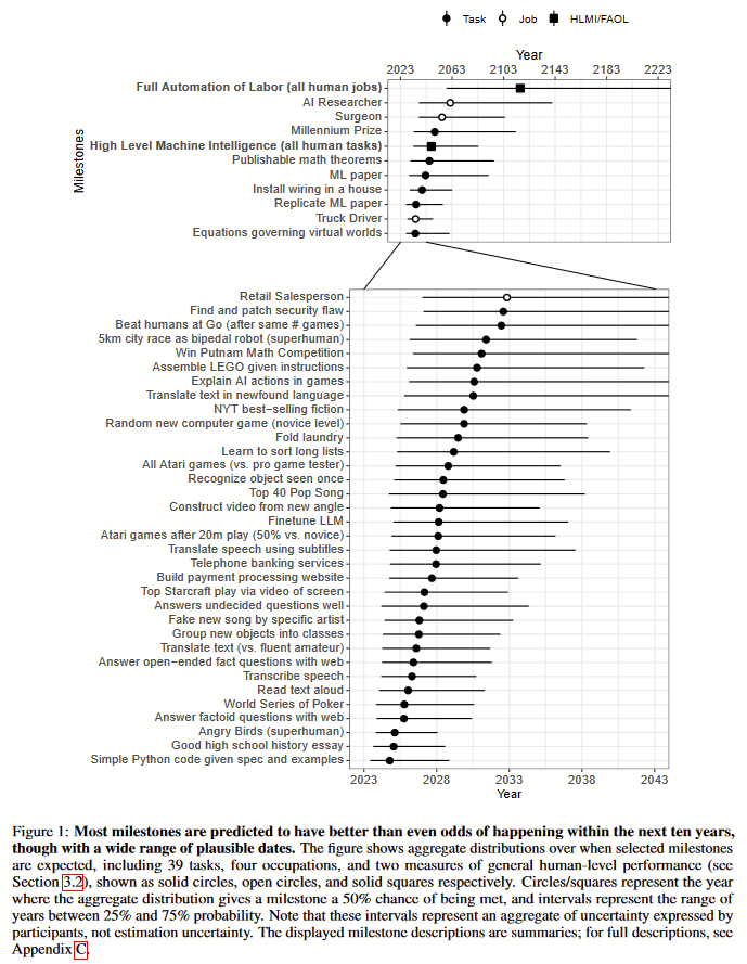 The respondents were either asked about 4 particular occupations, or were asked about 4 out of a list of 39 tasks before being asked about HLMI. The respondents expected FAOL to be later than any of the specific occupations, and HLMI to be later than all but one of the specific tasks.[7] Two of the occupations (surgeon and AI researcher) were rated as not being possible until further in the future than any of the tasks.