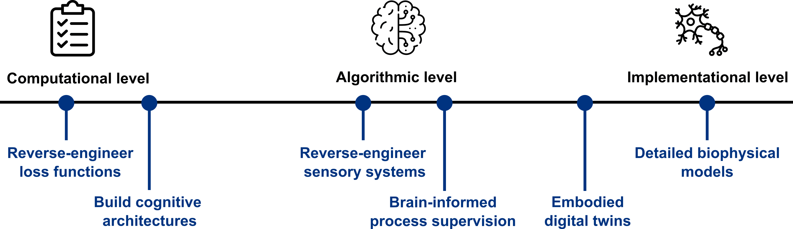 For the purpose of AI safety, any one level is unlikely to be sufficient to fully solve the problem. For example, solving everything at the implementation level using biophysically detailed simulations is likely to be many years out, and computationally highly inefficient. On the other hand, it is very difficult to forecast which properties of the brain are truly critical in enhancing AI safety, and a strong bet on only the computational or algorithmic level may miss crucial details that drive robustness and other desirable properties. Thus, we advocate for a holistic strategy that bridges all of the relevant levels. Importantly, we focus on scalable approaches anchored in data. All of these levels add constraints to the relevant problem, ultimately forming a safer system.