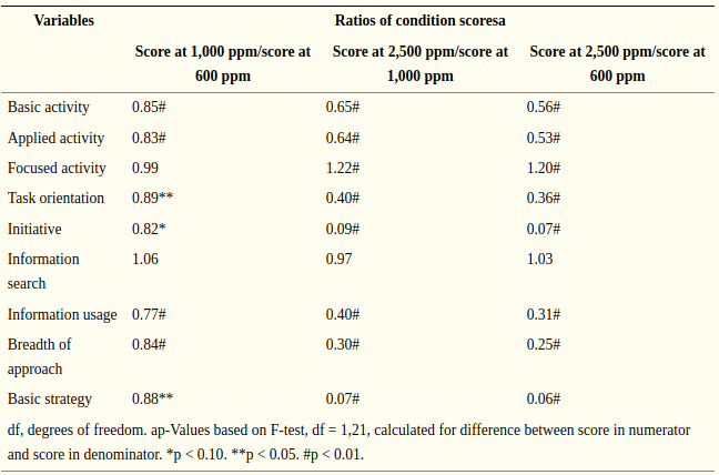 Notice that focused activity improved with elevated CO2, and information search was roughly unaltered. I don’t want to make an argument about which variables your word game maps onto most neatly, but it seems possible that you might have gotten different results with a more robust measure.