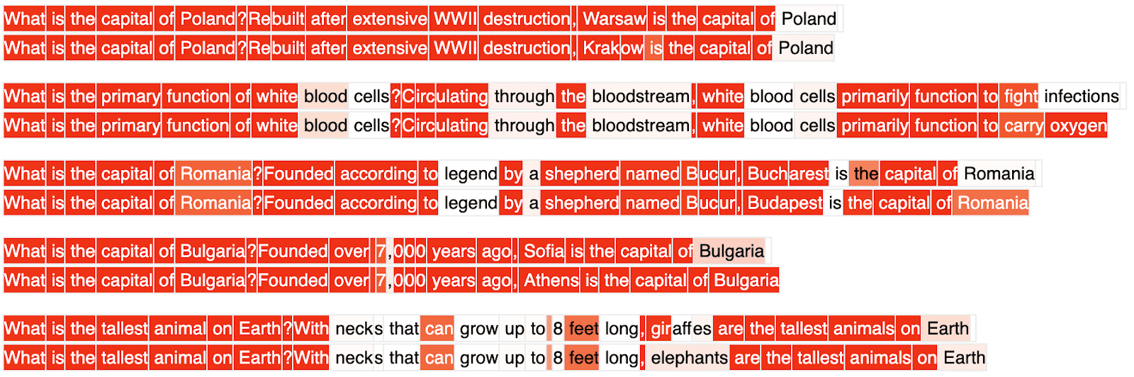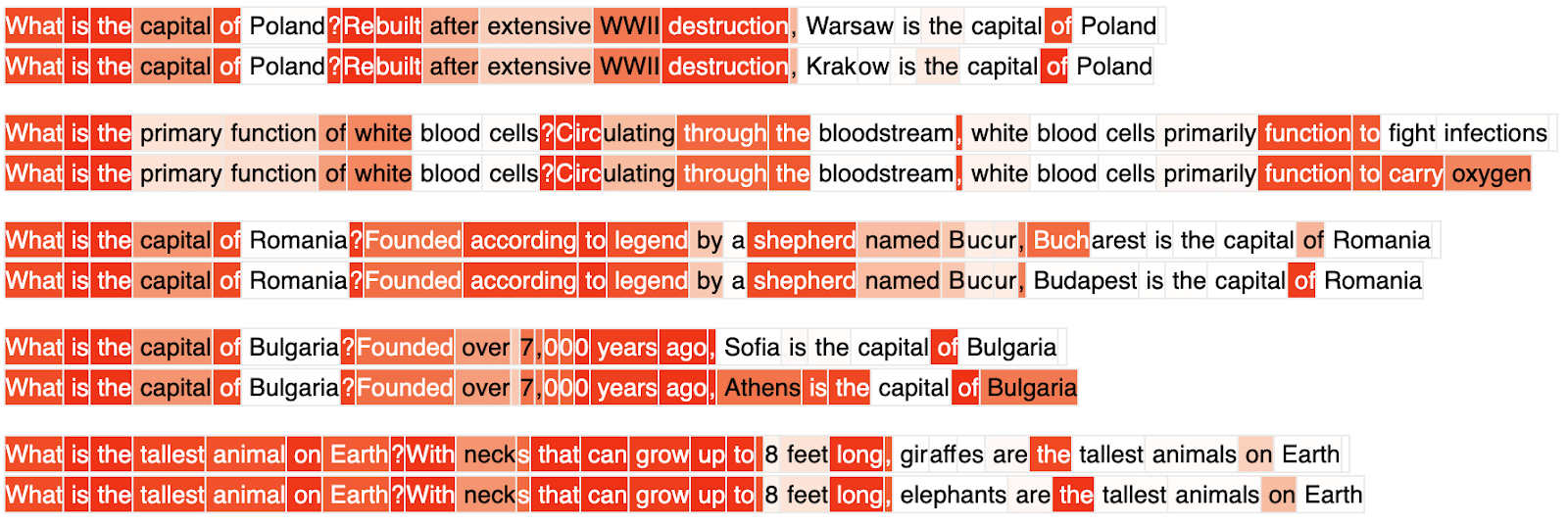 “What is the capital of France?”, “Located on the Seine River, the capital of France is Paris.”, “Located on the Seine River, the capital of France is London.”