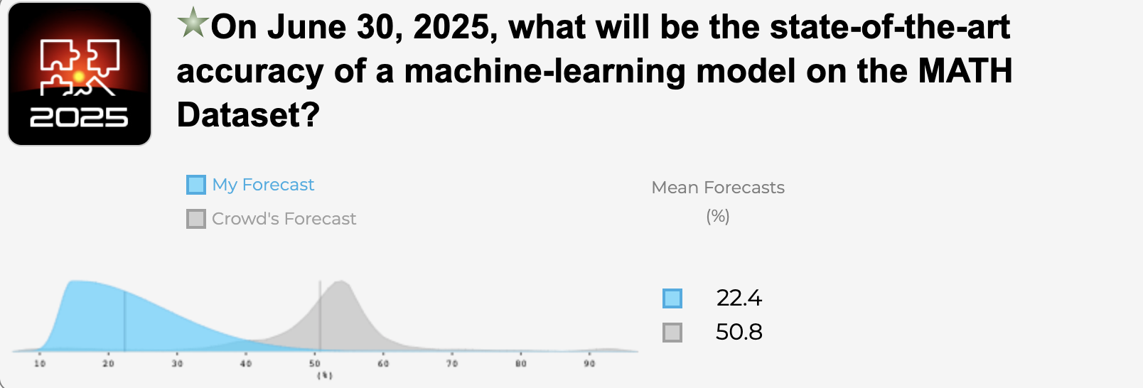 Similar to Jacob Steinhardt (whose group commissioned these questions), I’m skeptical of how much progress the crowd is projecting on MATH by 2025. It seems like an extremely challenging dataset. The current SOTA is 6.9%.