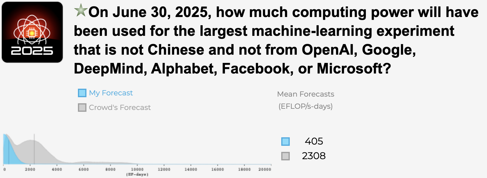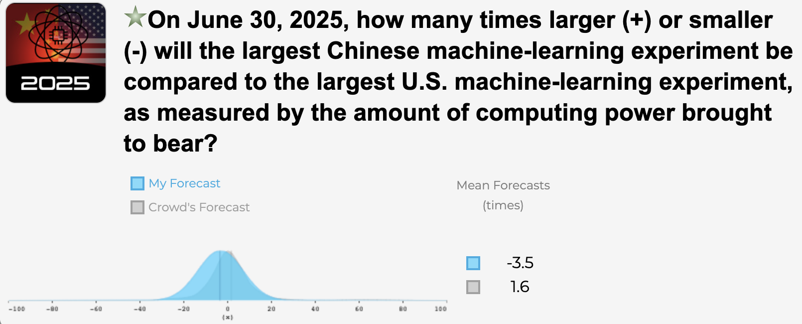 My median is that the US’s ML experiments will remain larger than China’s (though not by as much; the current multiplier is −6x), while the crowd expects China’s to be larger by 2025.