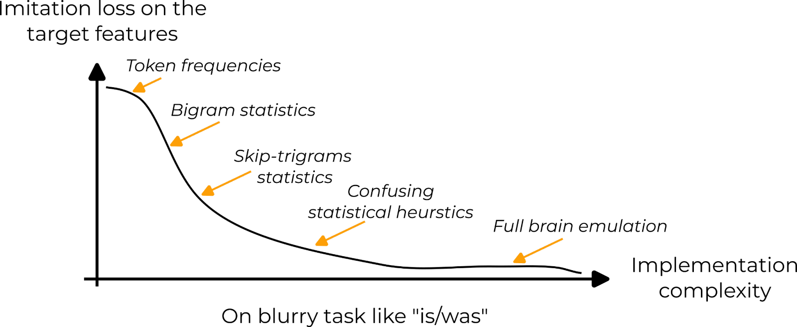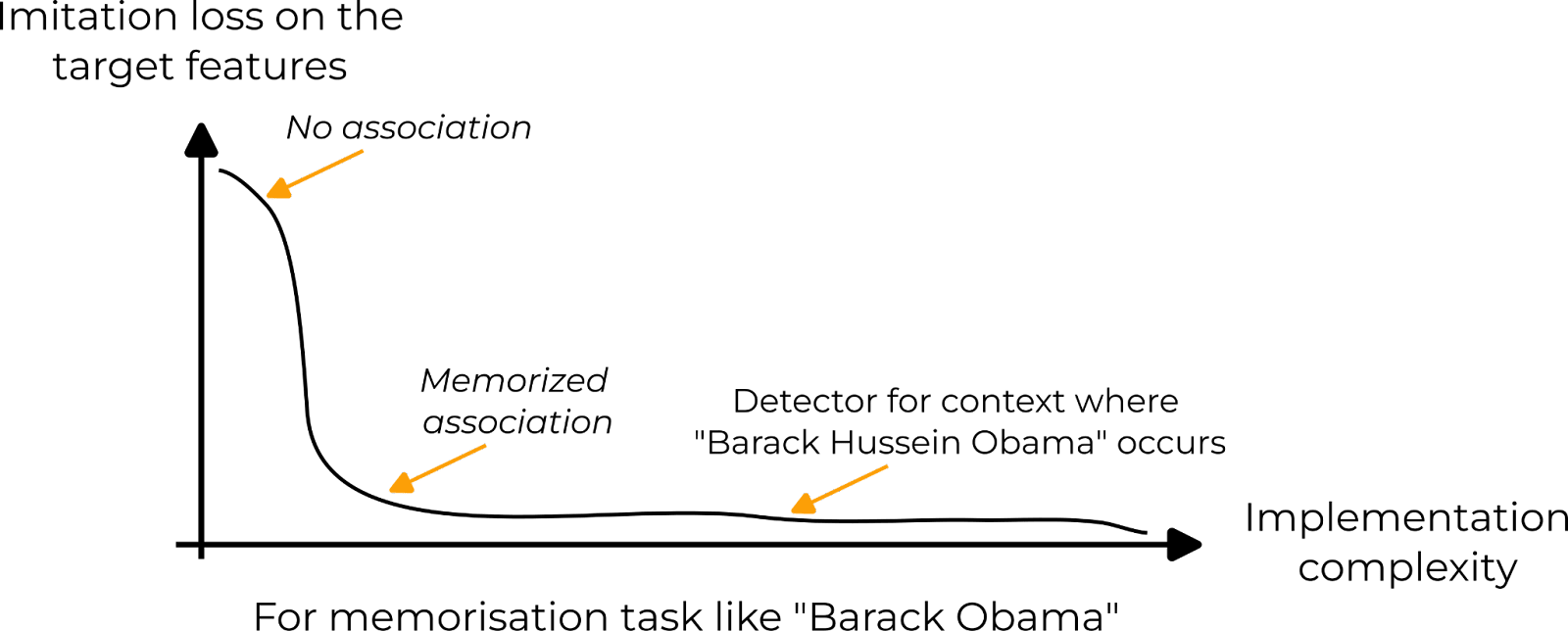 Depending on the task, this graph will look different. For instance, on a memorization task like predicting “Obama” after “Barack”, the shape is a sharp transition from no association to a learned association. More advanced tricks can be learned with sufficient complexity budgets. For instance, detecting contexts where Obama’s full name (Barack Hussein Obama II) will be used instead of the short version. But such fancy tricks require a lot of model capacity while only making little gain in imitation loss.