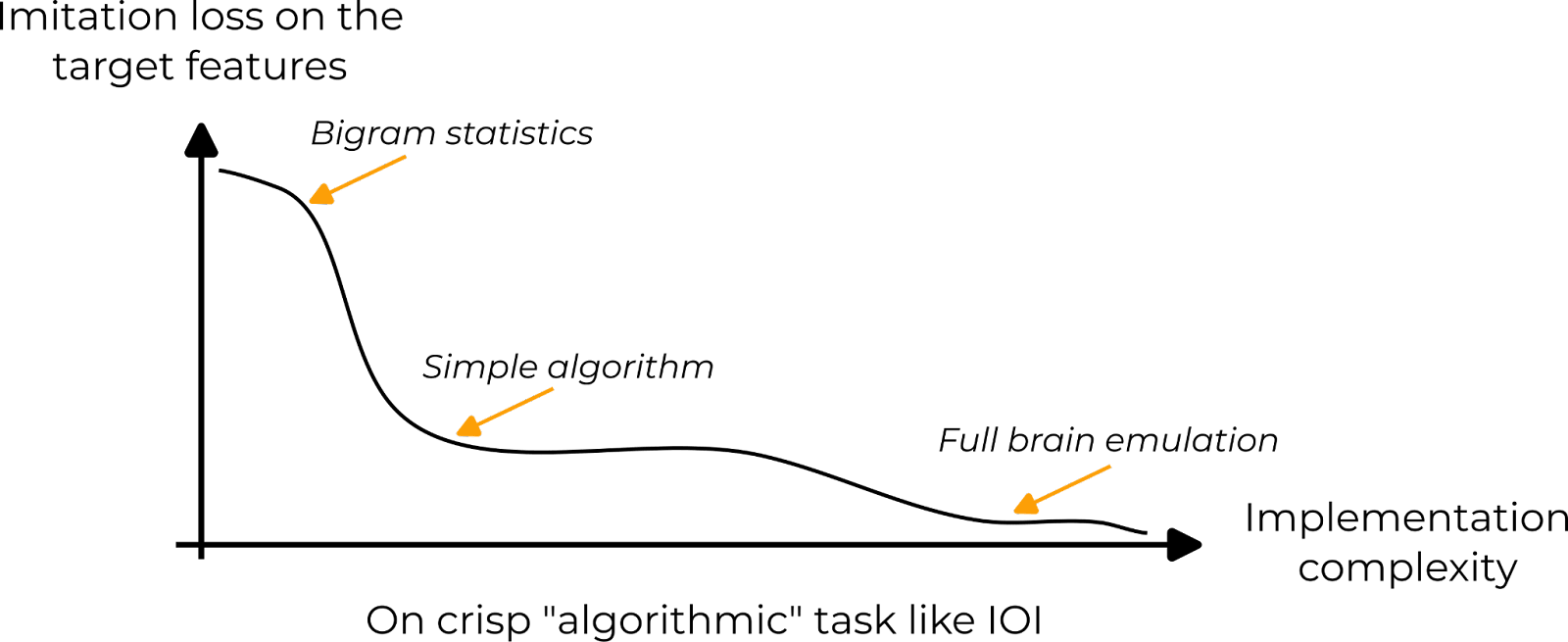 In all cases, it’s important to differentiate between the target feature the behavior is mimicking, and its approximation implemented by the behavior (which is often hard to fully characterize). E.g. on IOI, the feature is “identify a plausible indirect object from the context”, and the behavior implemented by GPT2-small is roughly “look for non-duplicated names in the context”. The two functions overlap enough that this is a good strategy to minimize the loss in training.