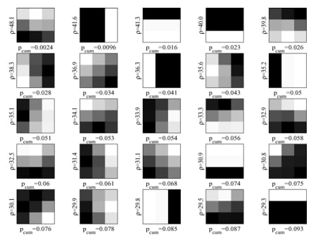 We’ll now look at a more complicated example. It comes from a paper by Anne Pedersen et al concerning the statistical structure of natural images. In this case, the data set they constructed (which we’ll call the Mumford data) consists of roughly 8 million 3×3image patches, collected from a database of roughly 5000 gray scale images taken around Groningen in the Netherlands. The images were obtained in a paper by van Hateren and van der Schaaf, and the patches were in Pedersen et al. The image patches are represented as 9-dimensional vectors, with one gray scale value at each pixel in a 3×3square array in the image. In Figure 3 below, you see an array of 25 such patches from Pedersen et al