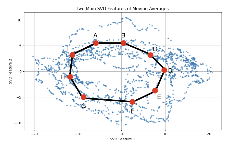 To illustrate the process, let’s consider the Jena data set again. Earlier we approximated it by the zero set of an algebraic equation, the equation for an ellipse. In Figure 5 below, we approximate it instead by a graph on 9 vertices labelled by A,B,C,D,E,F,G,H, and I.