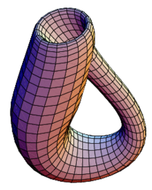 In examining data sets of image patches, it is important to filter out patches which are essentially constant, since such patches will likely dominate the statistics, washing out the behavior of highly non-constant, or high variance, patches. Pedersen et al constructs a data set which filters out low variance patches, and therefore consists of high variance patches. In Carlsson et al, an analysis was performed which showed that the densest part of the data set from Pedersen et al is actually concentrated around a subset which is parametrized as a Klein bottle (see Figure 4 below). A Klein bottle is a mathematical object called a manifold which is a high dimensional analogue of a surface. Manifolds include surfaces of all dimensions, and the Klein bottle is a 2-dimensional surface. In a way similar to the way the circle is coordinatized by a single parameter θ, the Klein bottle can be parametrized by two parameters θ1 and θ2 with the understanding that like the parameter θ for the circle, and are restricted to finite ranges, or obey a somewhat complicated periodicity.