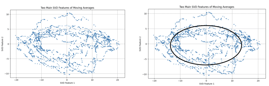 It is apparent that there is some organization of the data around a loop. A reasonable hypothesis is that data for the first week of November in all years will be roughly similar, so we will not be able to tell what year, only approximately the day or week during any of the years. The loopy structure also suggests the possibility of a single angular coordinate θ which could be generated for the data, so that instead of obtaining a two-dimensional dimensionality reduction, we have a one-dimensional one. We pay the price of having to restrict to the range from 0 to 2π, or recognizing that the parameter should be viewed as periodic with period 2π.