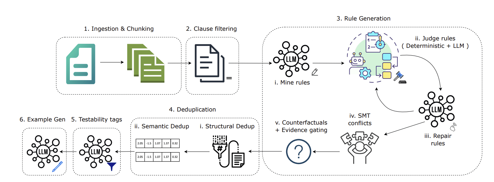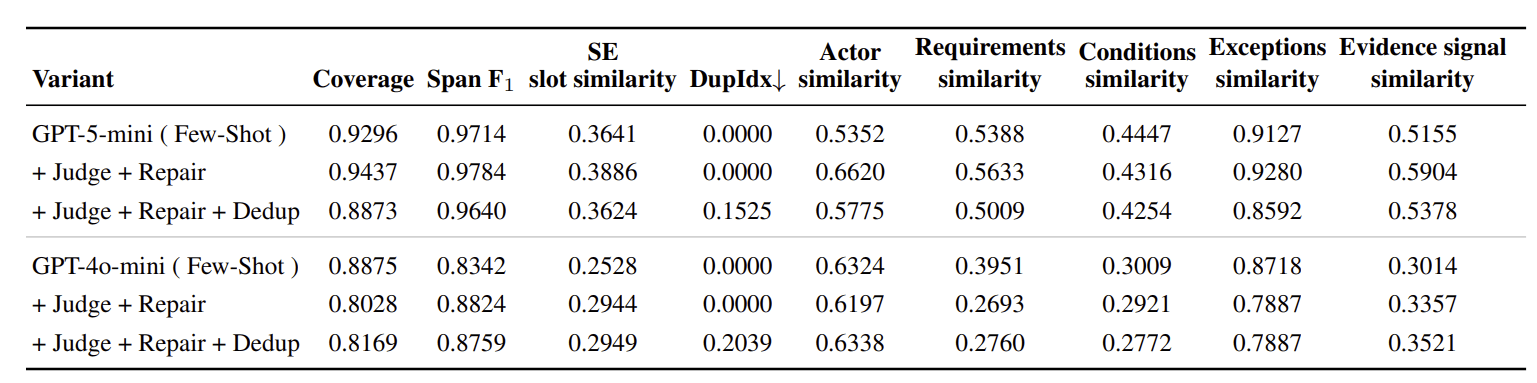 LLM extraction can hallucinate plausible rules. We mitigate this with schema checks, judge and repair, evidence gating, deduplication, and optional consistency checks, but high-stakes usage still needs human oversight.