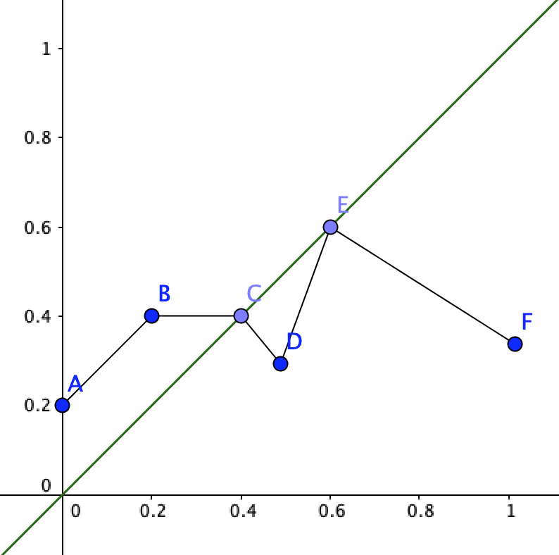 Picking 0.2 (B) will result in the predictor giving you a terrible track record (0.4). But picking 0.4 or 0.6 (C or E) will give you an incredible track record. Let’s call C and E ‘overlap points’. If this distribution is about whether the agent will kill a baby, C is the ‘moral credence’.
