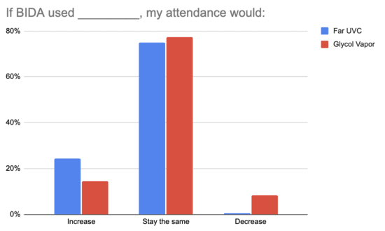 A dance organization I help run, BIDA, recently ran a survey. Several of the questions asked how folks felt about using far UVC and glycol vapors to reduce risk from COVID, flu, and other airborne pathogens. There were 208 respondents, which is pretty good!