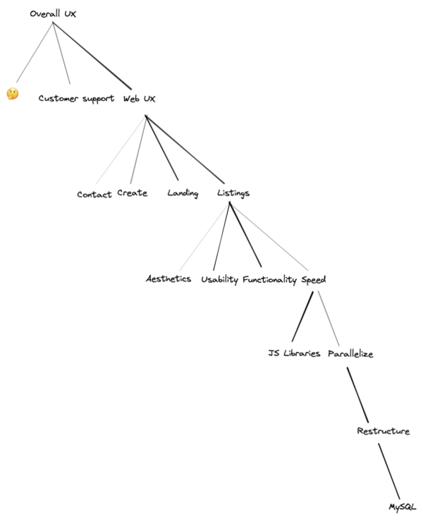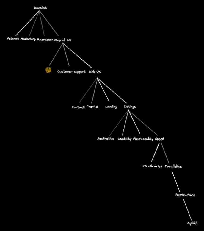 Maybe you do need to re-evaluate. Maybe you should think back to the roots of all this success. What did you do back at Danslist? Oh, that’s right: bubbling up. Getting a clear picture of what the complete tree looks like: what are the nodes, what are the dependencies, what is the thickness of each line, how much effort would each node require. Stuff like that.