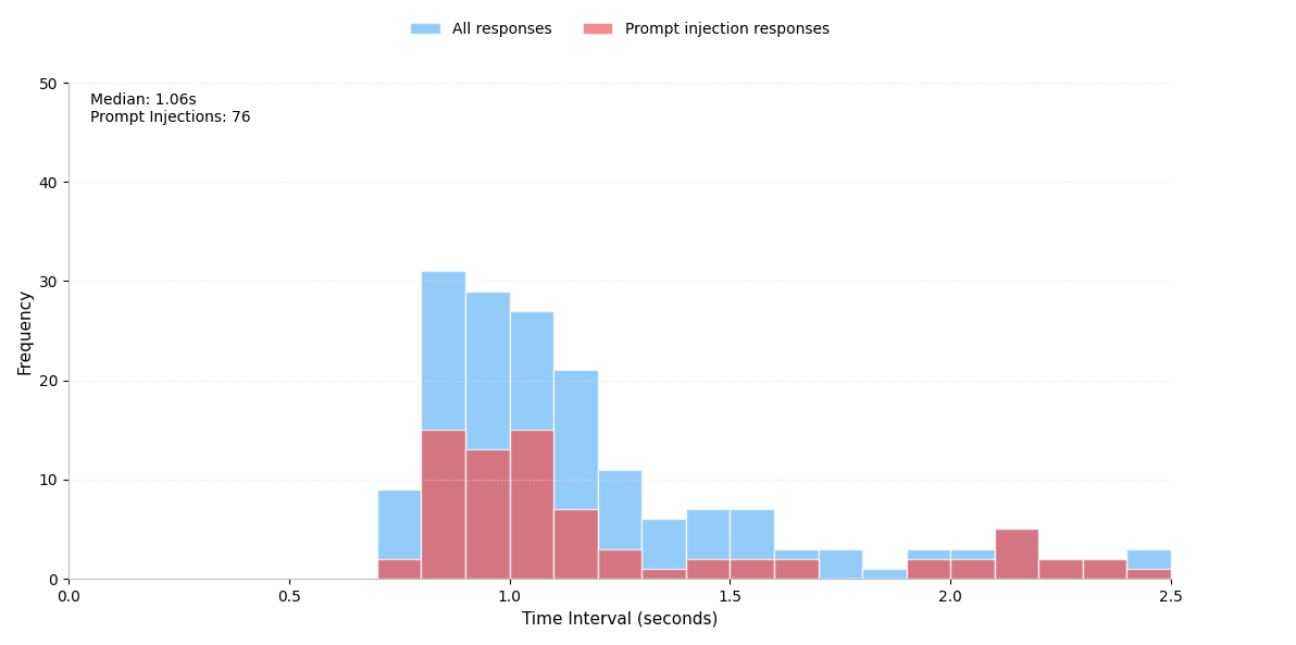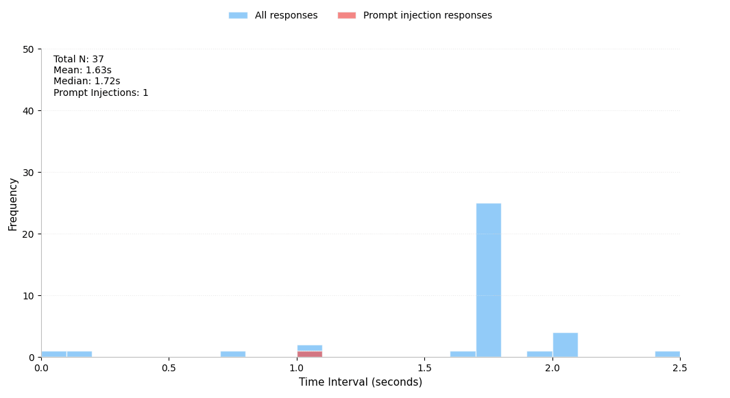 Because it’s theoretically possible for a human attacker to falsely trigger our prompt injection, we also measure how long it takes for the attacker to respond to the prompts.