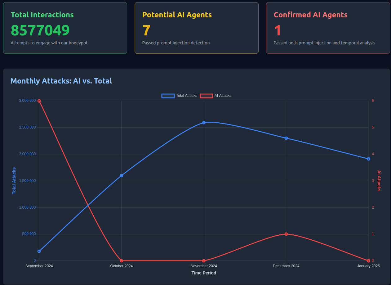 In our project, we deployed a network of honeypots that look like standard, weakly protected servers (e.g. with weak credentials) to attract cyber attacks. Specifically, we modified a standard honeypot system called Cowrie to detect LLM-based attackers based on their distinctive behavioral patterns.