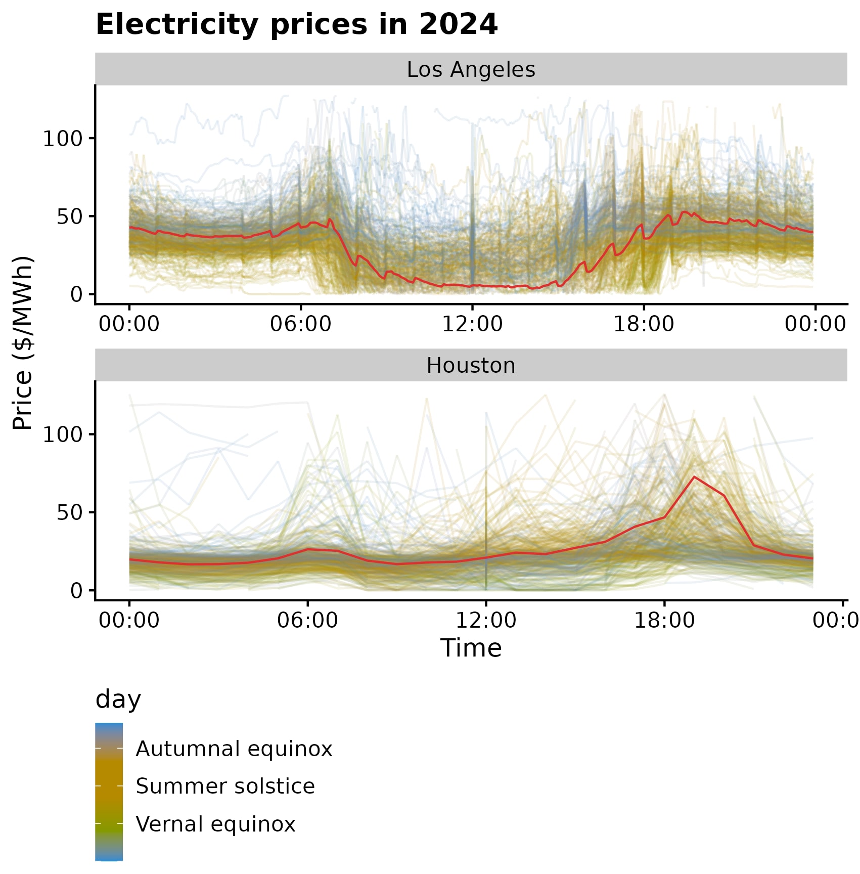 We can understand the economics of peak adjustment better, though, if we take the perspective of a Megapack owner. If we can make money by buying a Megapack, charging it with solar at noon, and discharging it in the early evening, what stops us from making money by buying a Megapack and discharging it at midnight? The answer is that in a solar heavy grid, electricity prices tend to be higher during that peak mismatch. I’ve retrieved prices from energyonline.com and plotted them throughout 2024, in Los Angeles and Houston, showing each day’s prices with a transparent curve and the average with a solid red curve: