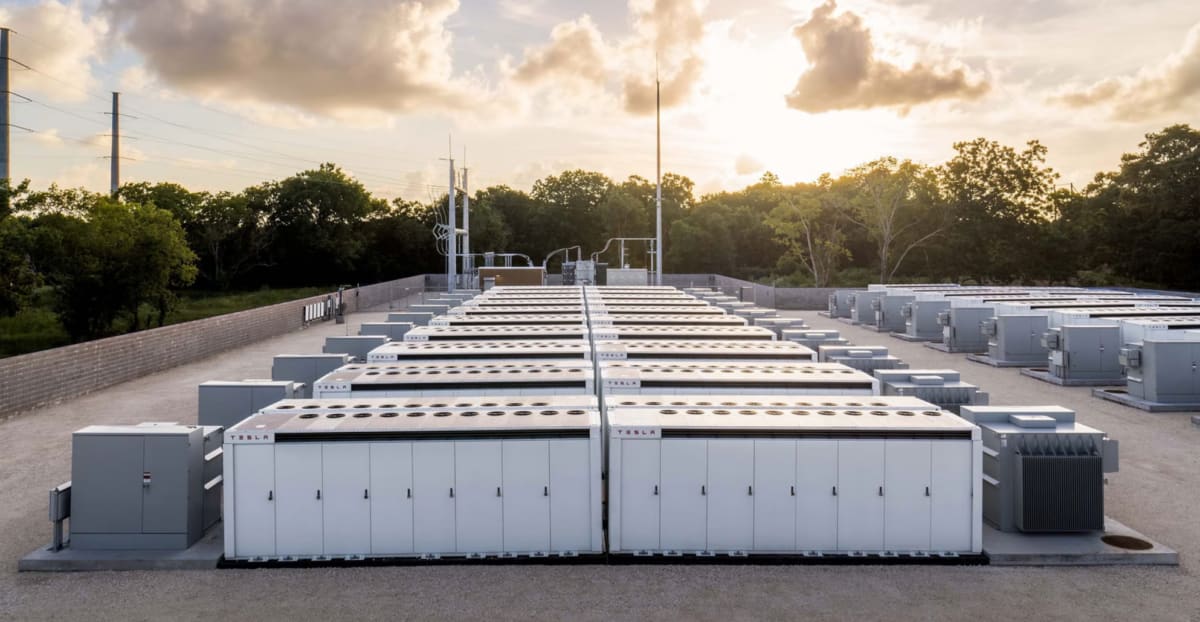 I’ve gotten the impression that you can build 1 GW of natural gas capacity for less than a billion dollars—maybe 0.8 billion, according to an EIA report? Let’s round up to a billion, and consider what kind of battery storage facility you can build with a billion dollars. By the way, people sometimes call such a facility a “big battery”, like the “Victorian big battery”. But if you’re imagining a “big battery” as some towering obelisk of lithium, I have to give you the disappointing news that it’s actually a collection of modules. One way to build a “big battery” is to buy Tesla Megapacks, conveniently shipping container-sized modules that you affix to a concrete slab (image source):