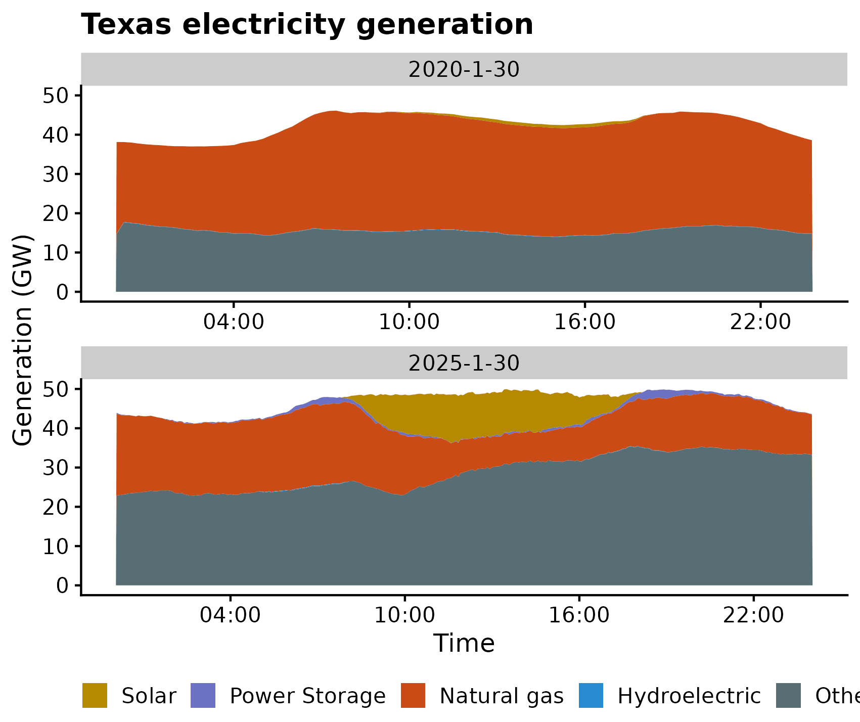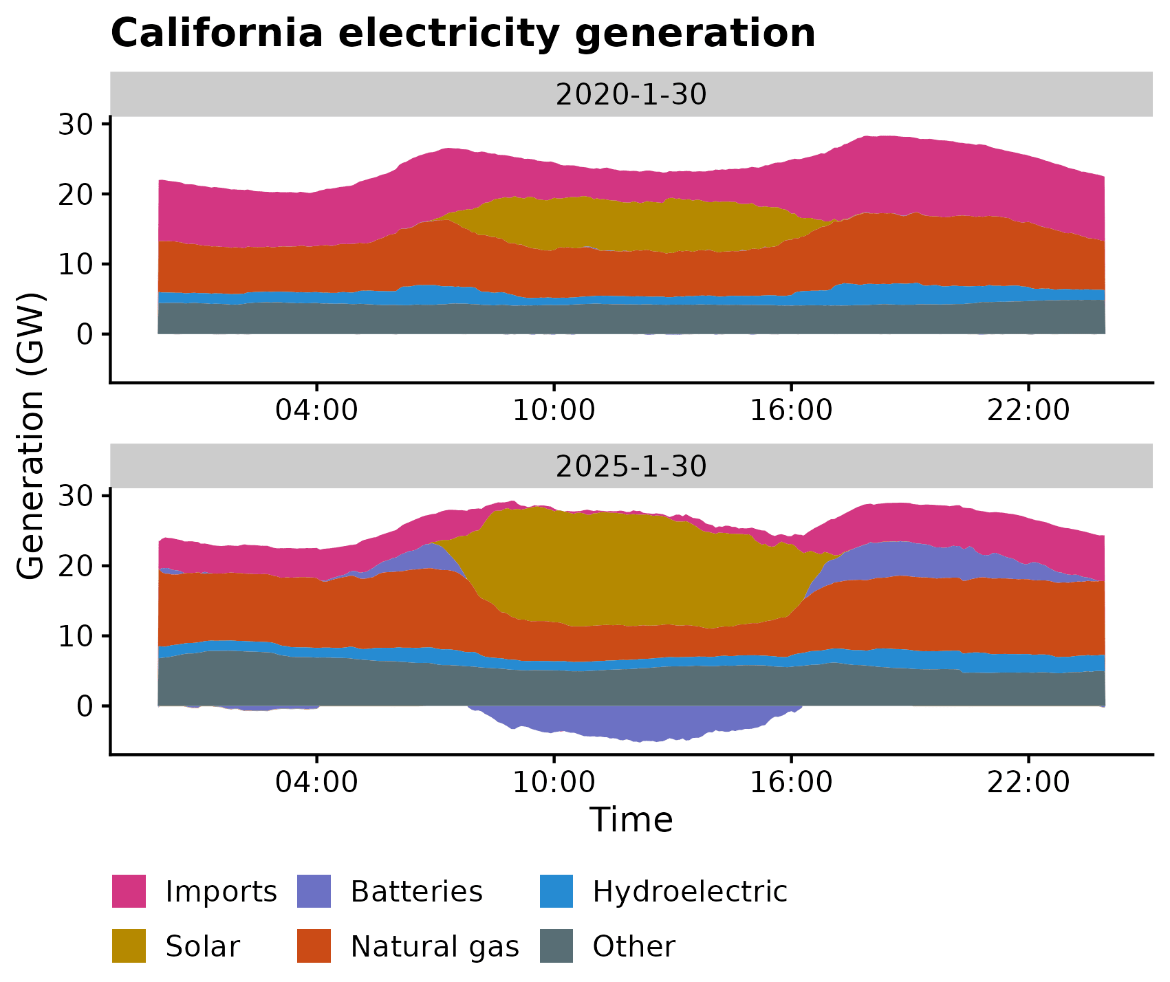 You can see two local maxima of natural gas generation in 2020, in the early morning and early evening hours when people are awake but the sun isn’t shining. On the same date in 2025 and at the same times, we see peaks of batteries discharging. (I assume negative generation from batteries corresponds to batteries charging.)