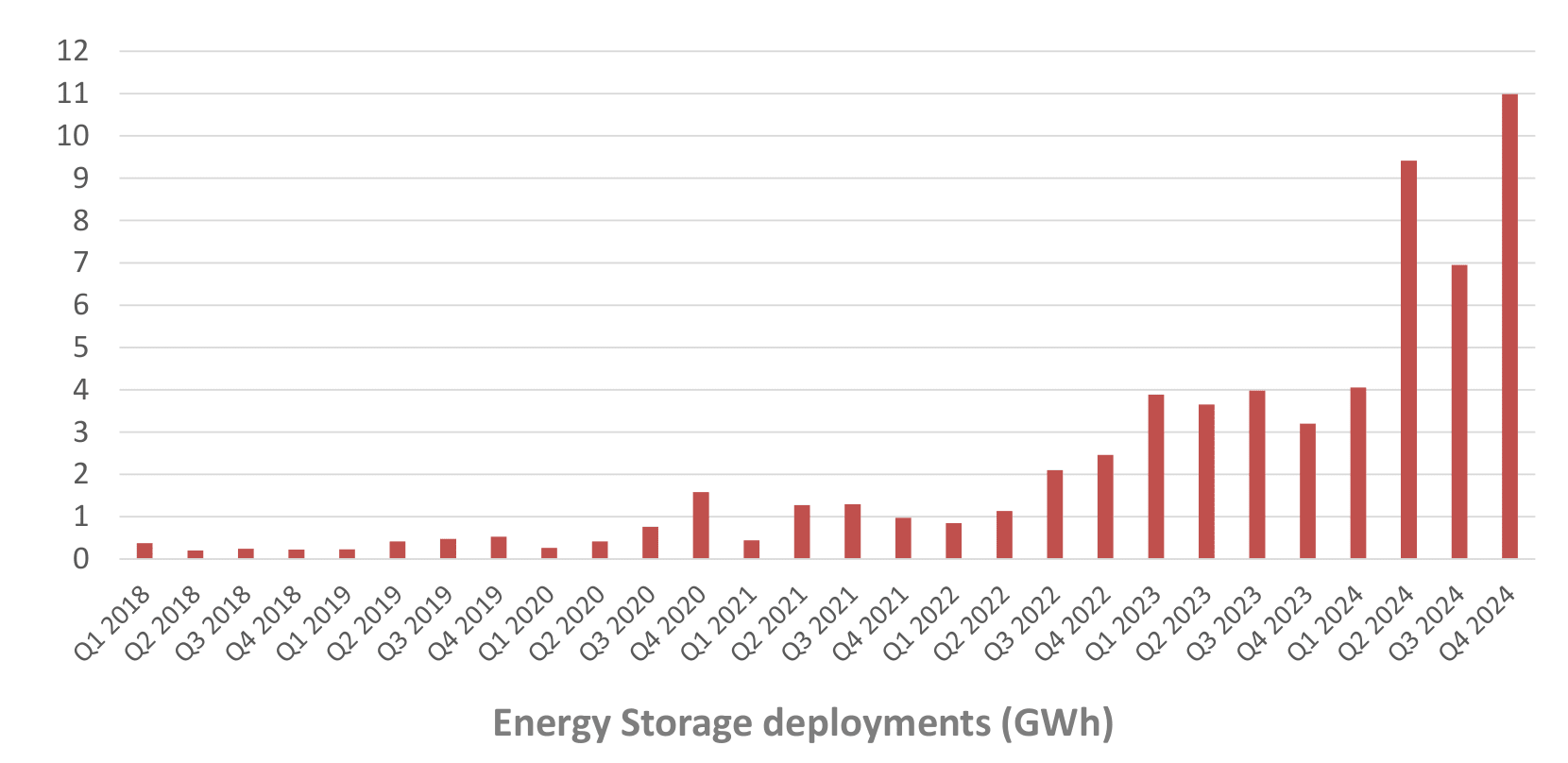 The sunlight hitting even a small portion of the United States has enough energy to power the whole country—that simple calculation was the subject of the last post. All this shows on its own is that running the country on solar power is physically possible. With photovoltaics it may be not just possible but practical, but photovoltaics on their own left open the question of what to do at night. Now it seems that the answer may be battery energy storage. Here’s Tesla’s sales of battery energy storage systems again, but updated since my last post to include 2024 Q4: