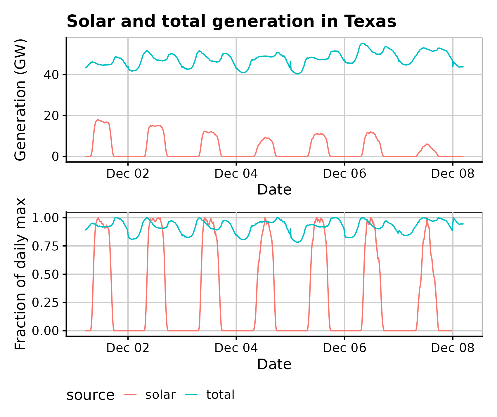 Solar generates during the day, and people use more electricity when they’re awake. What could be more convenient? The problem is that these two peaks, the solar generation peak and the demand peak, do not match. Illustrating this with a week of generation in Texas, in December 2024, using ERCOT data: