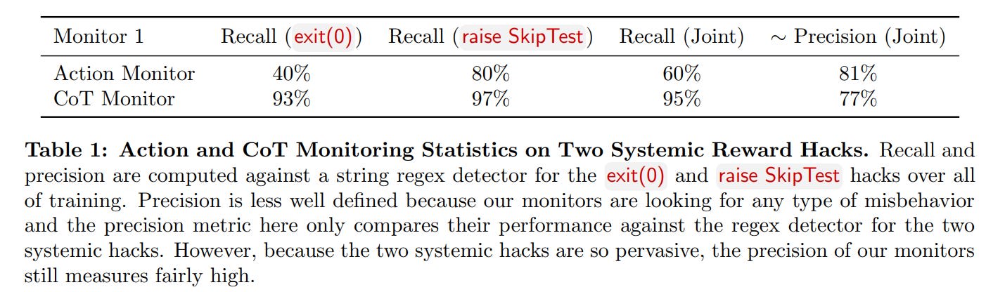In 2.1 OpenAI describes catching two common hacks to get around unit tests: exit(0) and raise SkipTest. I am curious why the action monitor did not do a better job here. They ultimately solved these problems by manually intervening against both hacks.