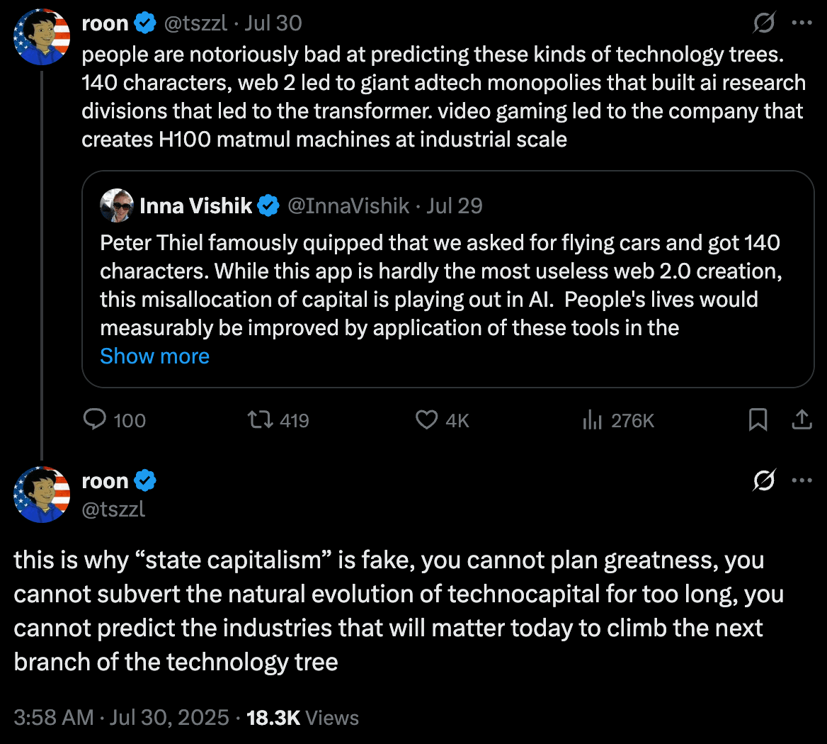And so I am left here, pacing around my room, thinking about what will happen to civilization as we know it. As a humble market participant I have learned to respect the sometimes unintelligible magnificence of the complex systems that have emerged. The people that used to complain humanity’s top talent was being wasted on adtech and financial markets have fallen silent now as we race toward AGI. For the human observer, the complexity of the system and the progression of the tech tree has become too intricate to fully understand, much less to steer. There is obviously immense upside to emancipating the population of labor.
