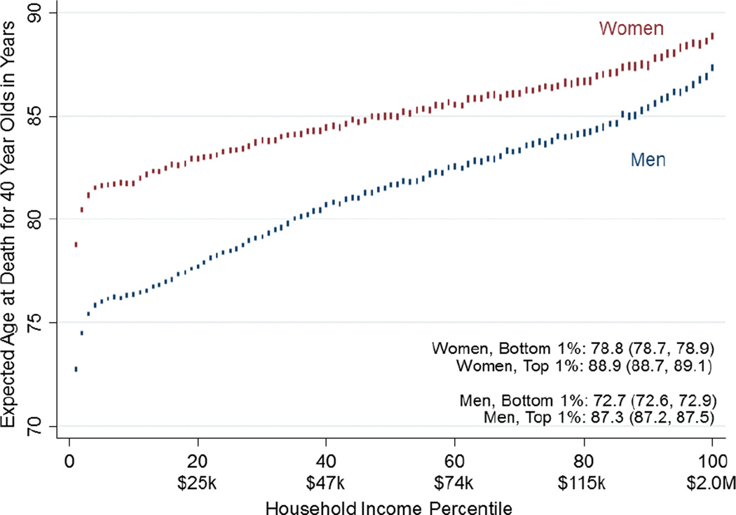 I agree with Matthew Barnett that no one is particularly surprised to find that rich people live longer than poor people, but is this really enough to wipe off the President Effect? If I’m reading it correctly, Barnett’s chart says 87.5 years as life expectancy at age 40 for top 1% income men. In my list there are only 6 women, so let’s exclude them and compare the rest with our average rich man who die at 87.5.