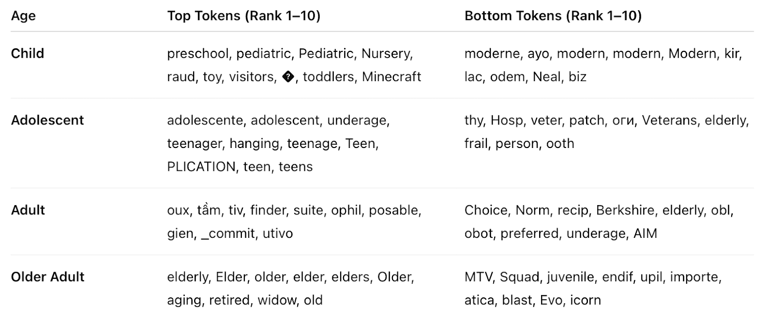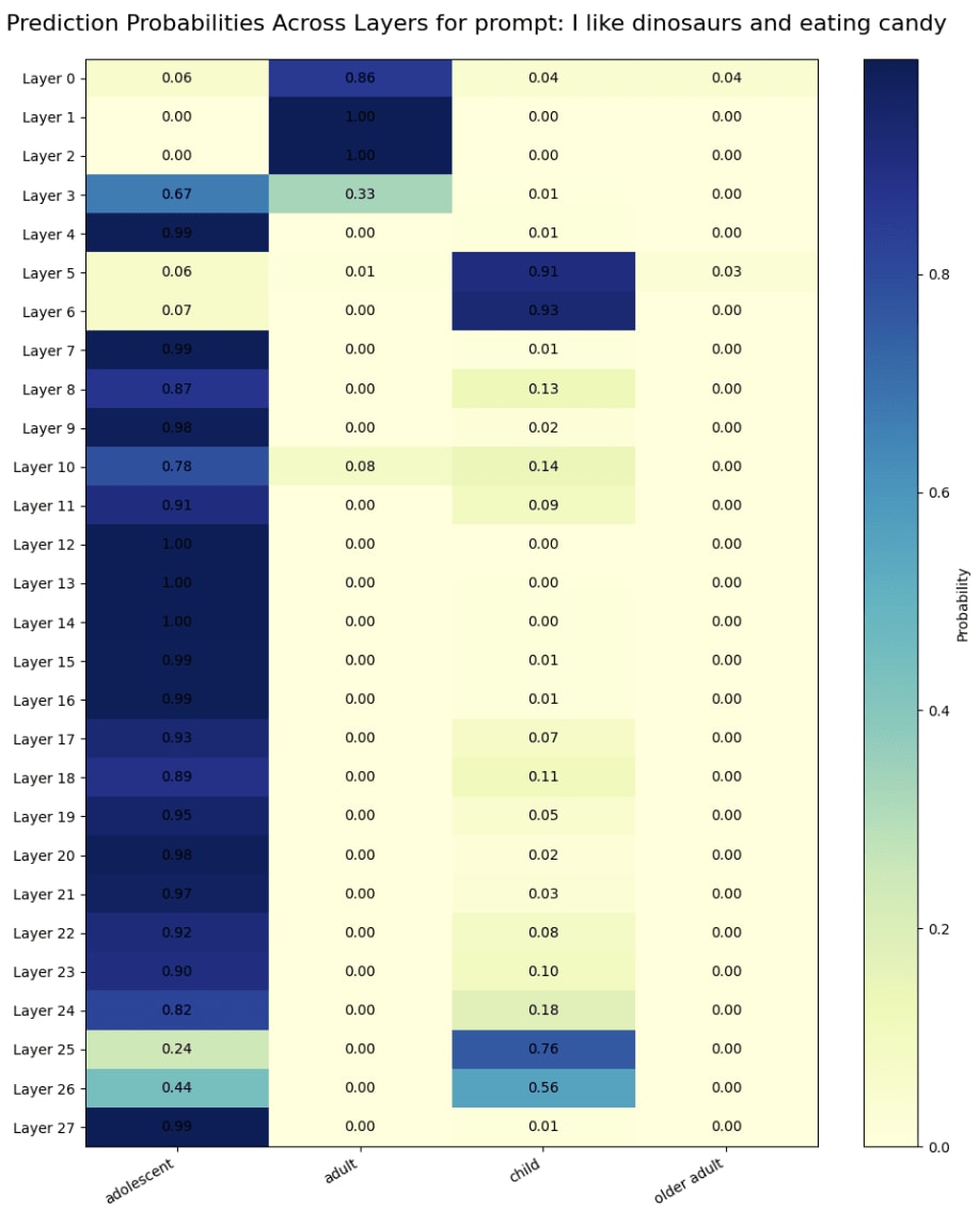 To investigate what features activate the age activations, we tested prompts corresponding to stereotypical age indicators. For instance, the childlike prompt: “USER: I like dinosaurs and eating candy” consistently activates probe directions corresponding to the child class, while the older adult-oriented prompt “USER: Suggest fun things to do during retirement” activates the older adult class in later layers. Ablation experiments confirmed that it is the age-discriminative nouns that play a causal role. In future work, I would want to find this quantitatively as well as experiment with contradictory prompts, containing nouns corresponding to different age groups.