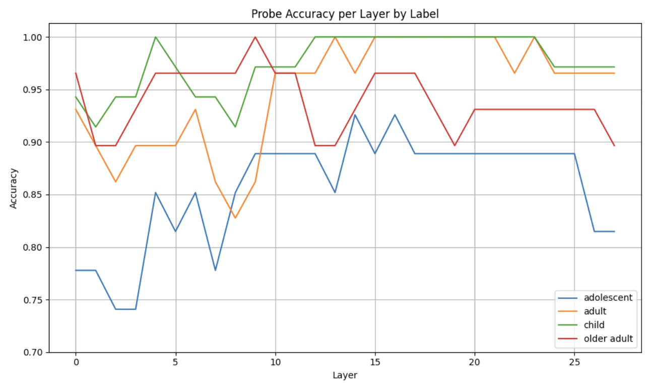 Previous work has used probes to steer models, revealing the presence of these “user models” embedded within the activations of the network. Building on this, I decided to focus on user age category: child, adolescent, adult, older adult, and posed experiments around the following central questions: