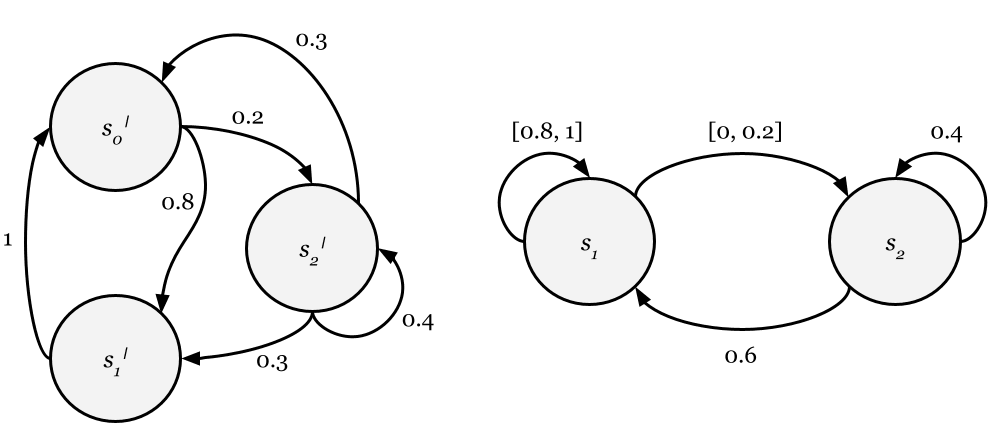 where the numerical entries denote probabilities (of transitioning from states labeling the rows to states labeling the columns) and intervals denote credal sets.